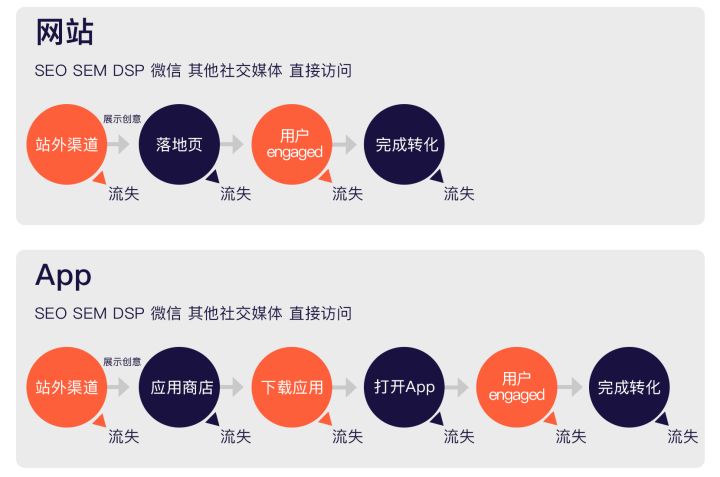 从用户旅程来看,渠道的监控分析主要分为两个阶段,一个是用户到达产品情况的监控,即点击投放链接的情况,另一个是该渠道的用户在产品内的转化和留存情况。不仅要看渠道用户的数量,也要看质量。