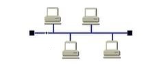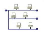 总线型结构采用一条公共总线作为传输介质,每台计算机通过硬件接口入网,信号沿总线广播式传送。总线型网络拓扑结构如下图所示。