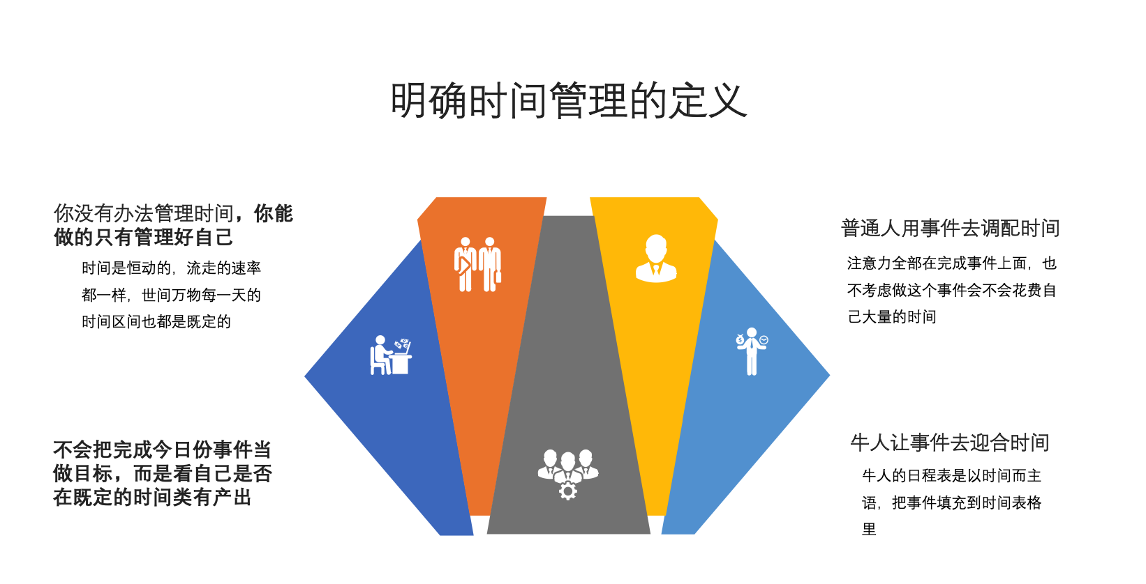 牛人的日程表是以时间而主语,把事件填充到时间表格里,他们从来不会把完成今日份事件当做目标,而是看自己是否在既定的时间内有产出