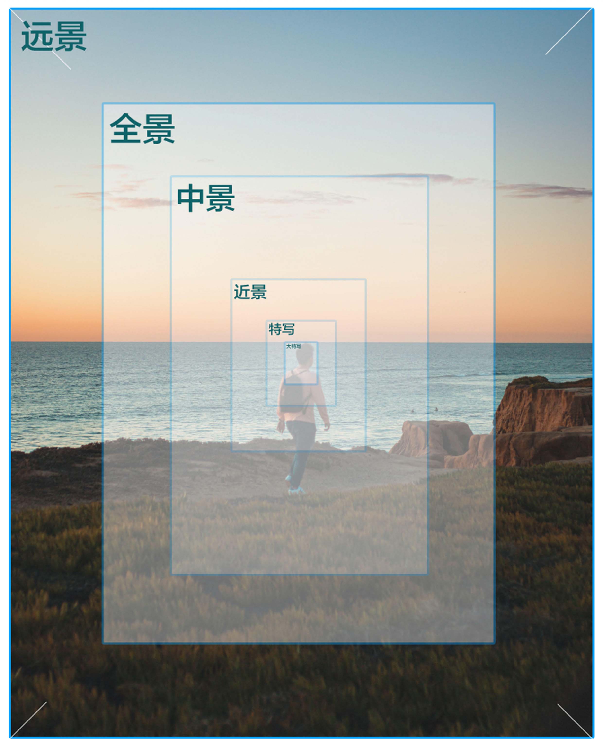 景别的划分,一般可分为六种,由远到近,分别是: