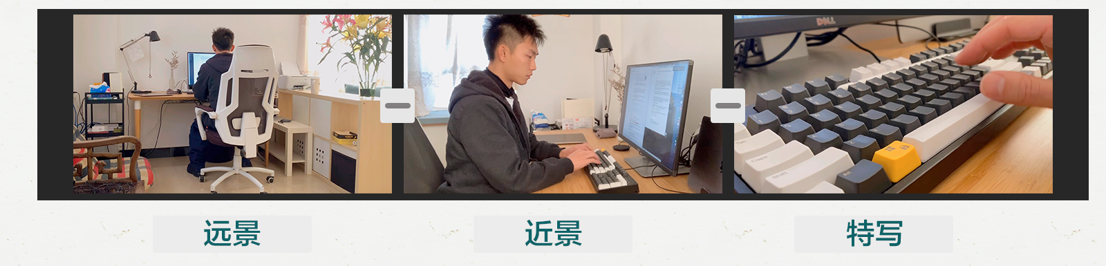 上面是我拿三角架自拍的,大家看这3个素材,是不是有很明显的区分?而这三个素材的顺序怎么组合,其实问题都不大的,因为在短视频中,没有那么多条条框框,也不涉及故事情节,所以,初学阶段的大家,可以围绕这一个事件,比如上面的事件是拍摄我在家里办公的情况,用了远景-近景-特写,进行的拍摄,那么剪辑的时候,围绕这个事件,可以随意排列,意思就是通过多个景别来告诉观众,我在家里办公的这个事件。