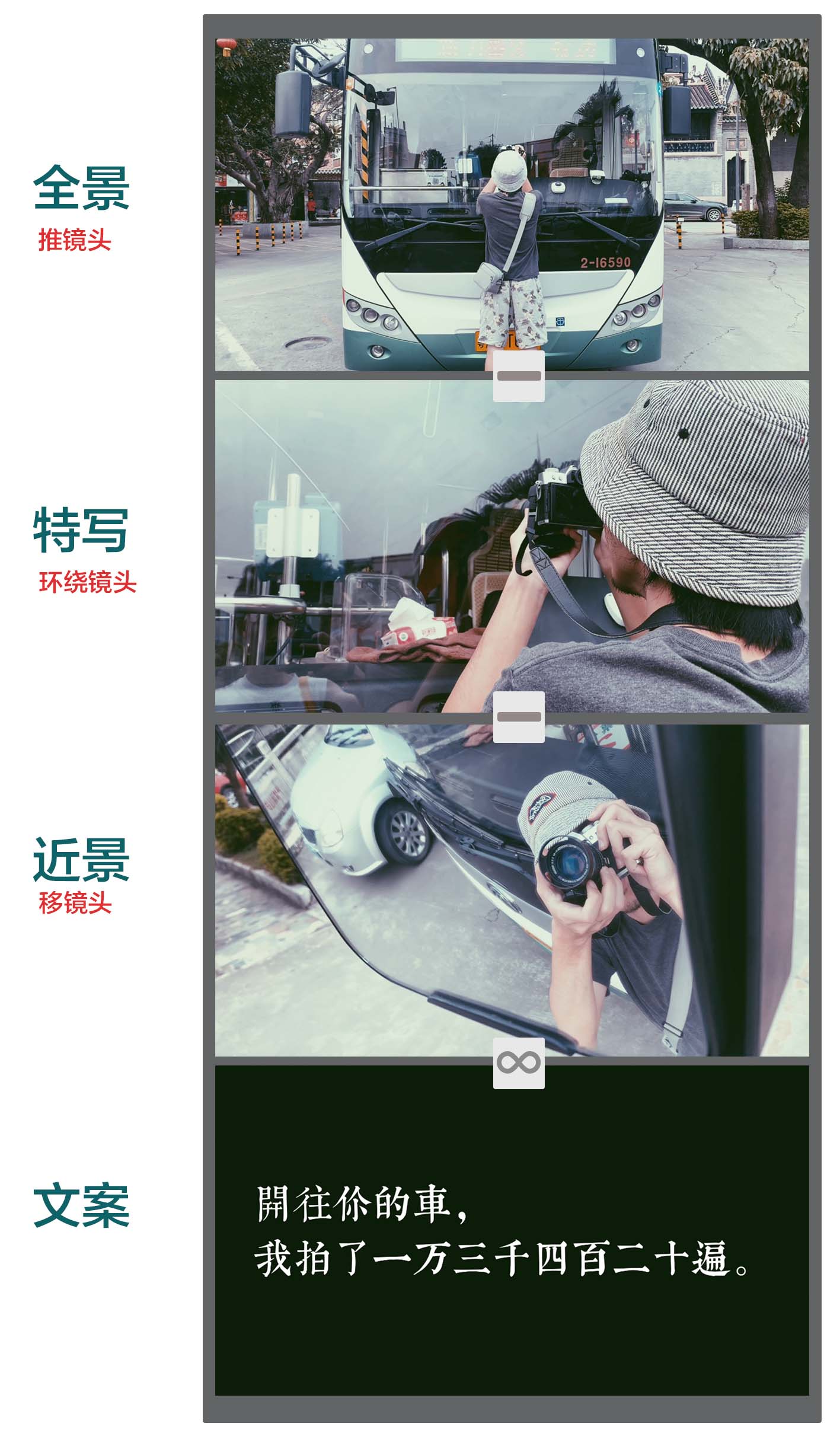 大家看到的视频分镜,用的是:全景+特写+中景,最后黑幕,加上一段文案,配上合适的音乐。出来的整条视频其实就是拍了这3个素材,拍摄5分钟不到的时间,但是已经完整地表达出我想要表达的内容了。