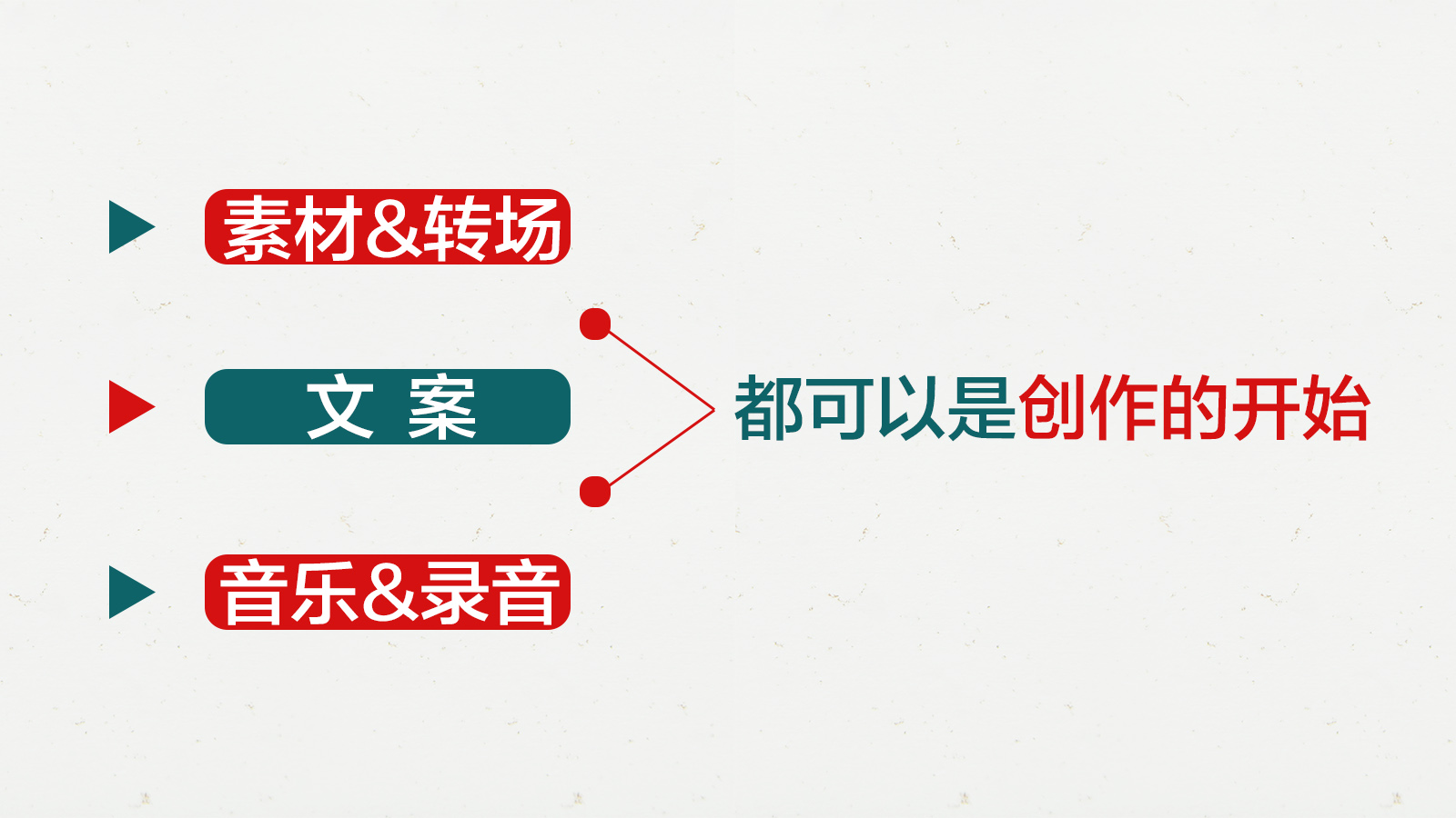 当大家把拍摄练熟了以后,再来回顾一下剪辑的地图,素材&转场+文案+音乐/录音。三个基本要素组合完成你的创作,剪辑其实呢是一个创作的过程。画面内容怎么表现完全取决你们自己。素材的【排序&转场】,【文案的撰写】,选择一首怎样的【音乐】。这3个基本要素,哪一个是创作的开始都可以。
