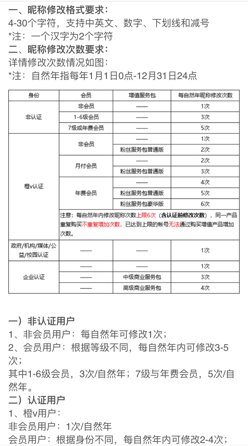 具体不同等级的用户,修改昵称的次数则不同,详见下图