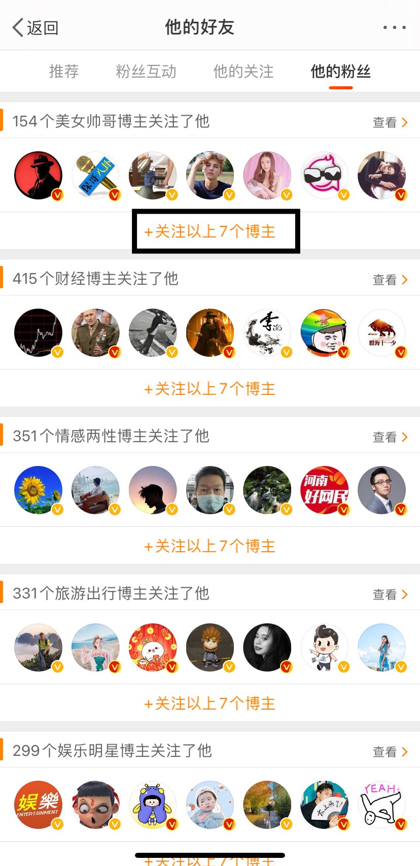 勾,顾名思义,就是勾引对方,吸引对方的关注,打铁还需自身硬,所以这也是前面提到的初期要做包装。先主动去关注大V博主,简单一点可以批量关注,比如,你现在打开李红亮老师的微博,微博名字就是:李红亮,点粉丝数字,1020万,划到“他的粉丝”能看到有很多排各领域的大V博主,分别是“美女帅哥博主”、“财经博主”、“情感两性博主”、“旅游出行博主”、“娱乐明星博主”等等,可以看下图,每两排中间都有“➕关注以上7个博主”字样,那么,你可以直接点这里,一键关注了这7个博主,操作完可以返回操作下一排,以此类推即可。