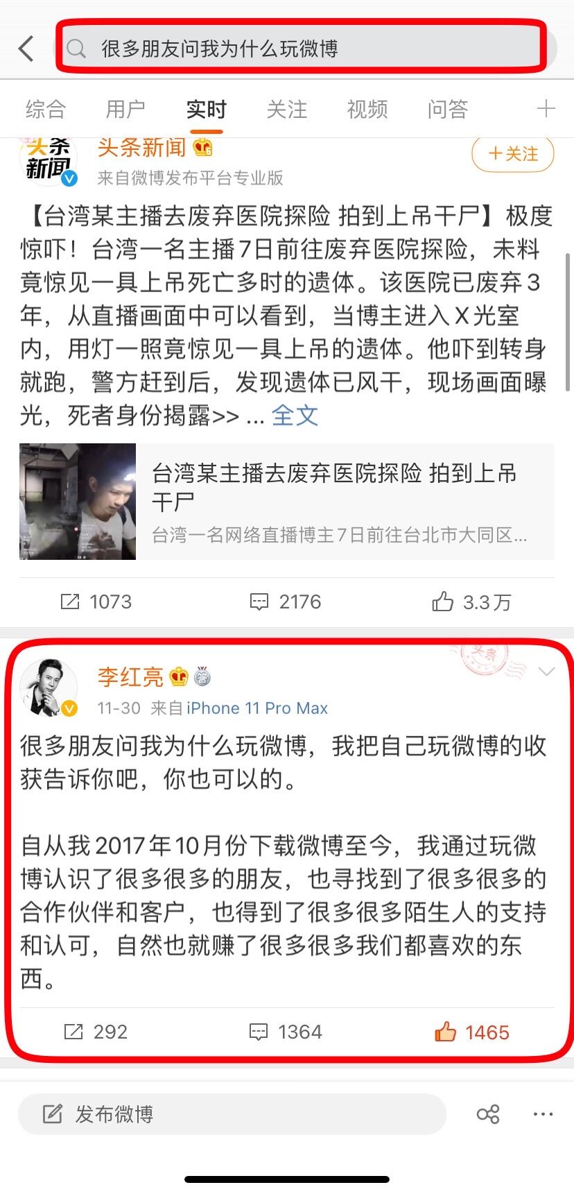 实时号可以让更多潜在粉丝看到自己发布的博文,实时号对微博账号涨粉和提高阅读量有很大的帮助,如果你的微博账号不是实时号,一定要养成实时号。普通号发的内容基本没有阅读量,实时号发的内容当时就会被更多粉丝用户看到。在微博搜索其中一句博文内容,在综合、实时都可以看到,内容有价值可以上热门,获得高阅读,普通号上不了热门。这里说明一下,可能你的号是延迟几分钟显示,也可能是秒显示,也就是发完就能搜到。
