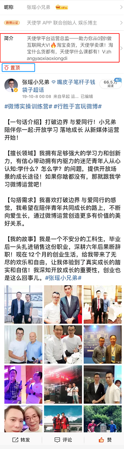 第二,个人简介和置顶微博!个人简介和置顶微博都是能够在短时间,抓住粉丝兴趣的一个地方。个人简介的字数要少一点,置顶微博的字数要多一点!对于初期刚玩微博的博主来讲,我们还没有形成自己的风格,更没有打造出来自己的个人品牌!这个时候更需要好好的打磨一下自己的置顶微博和个人简介!