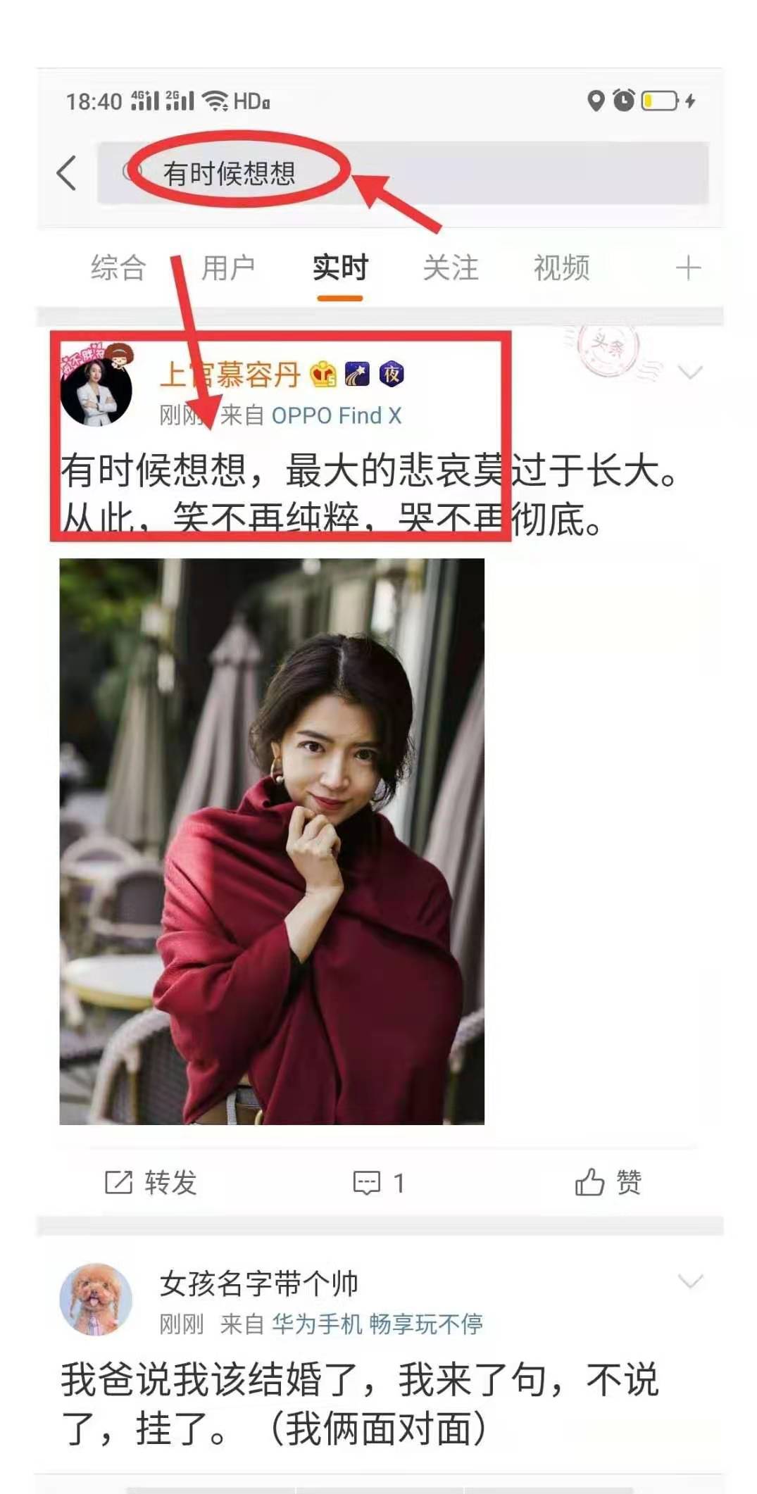 在微博搜索一下你微博刚刚发布的内容,试试能否被搜索到,比如关键词“有时候想想”是刚刚发布内容的文字,经过搜索检测发现@上官慕容丹 的博文,也就证明@上官慕容丹 微博账号目前当下是实时号,(综合是按热度排名,实时是按时间排名)如下图: