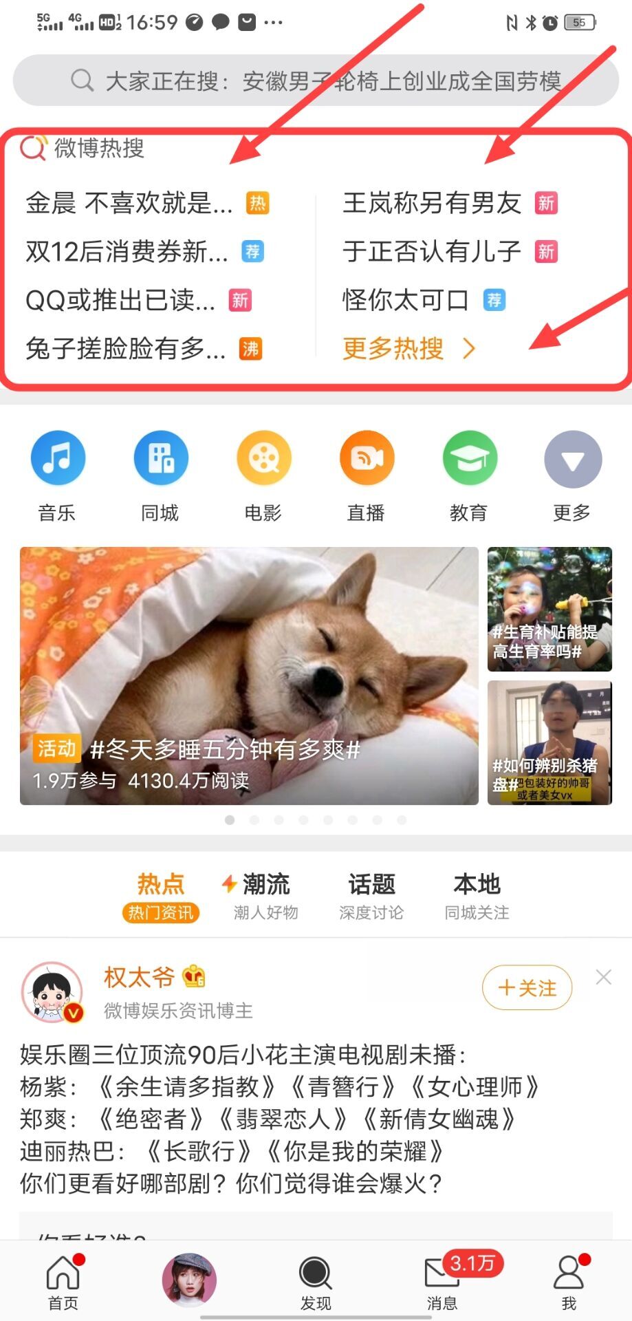 什么是热搜话题呢?就是热搜榜上的话题热度比较高的话题,一般跟明星相关的热搜话题比较多一些,更容易获得高的阅读量。在自己的微博主页点发现就可以看到顶部都是热搜话题,如图所示: