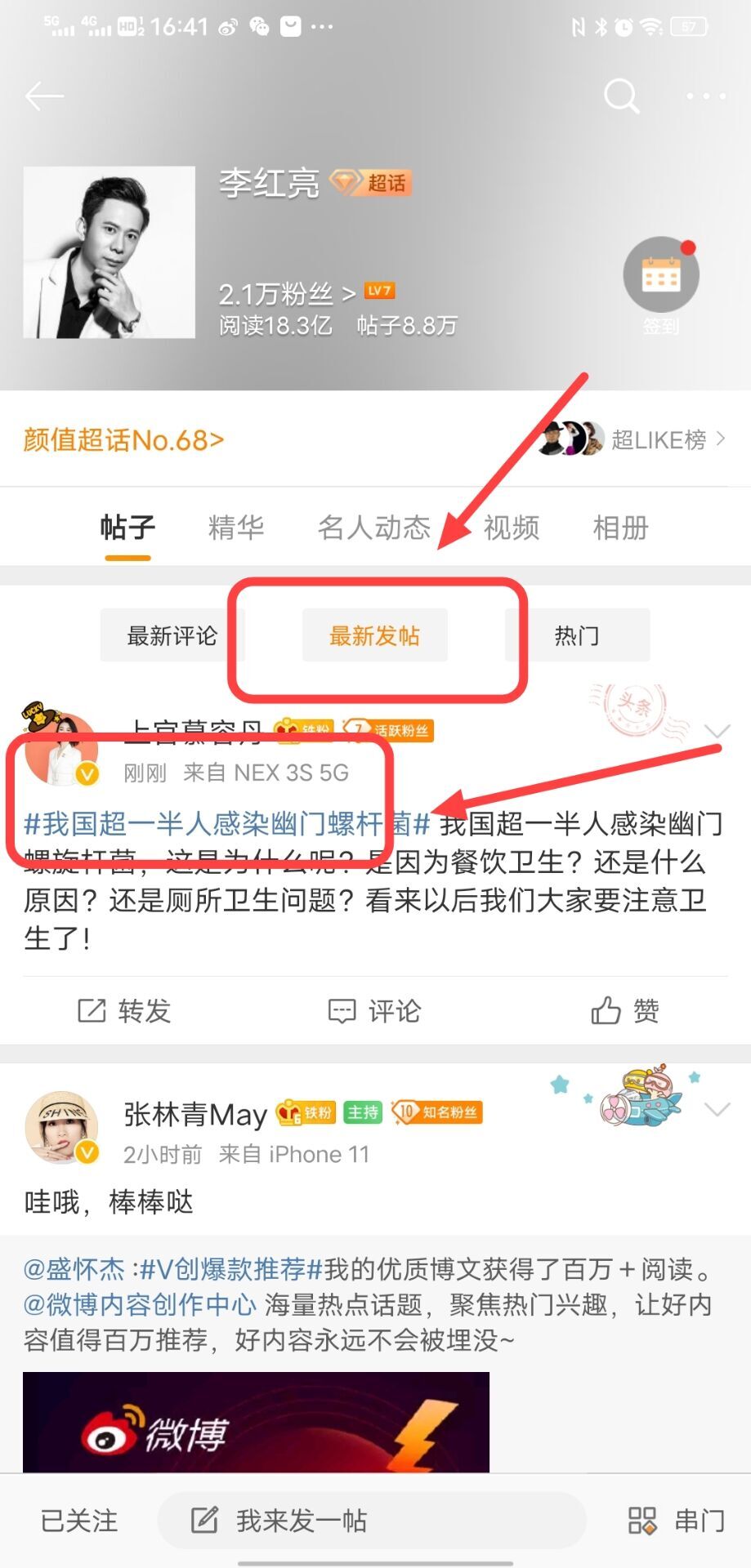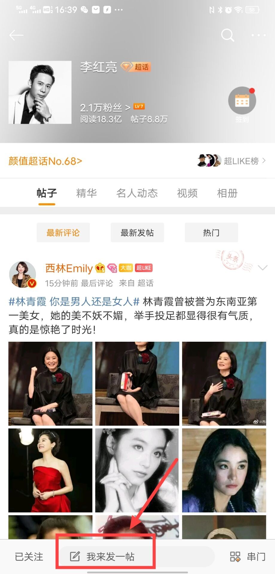 我来给大家具体演示一下,在李红亮超话里面发布带有热搜内容的一个详细步骤,以图片的形式给大家展 :