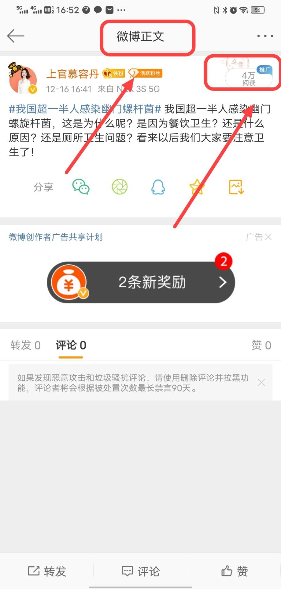按照以上 图片的操作步骤,一步步的去操作就可以了。大家通过最后一张图片,可以看到我这条博文阅读量当时是四万,也就一分钟的事儿!带热搜话题去发布微博,就可以轻松获得,很高的阅读量!每天多发布一些带有热搜话题的博文,就可以轻松获得1000万的阅读量成为金v。只要发博不超过100条,基本就没事,我相信大家也发不了100条!一定要切记发布的内容,一定要跟热搜话题内容相关,一定不能字数太少,否则会掉实时。掉了实时号,咱们就不能再发带有热搜话题的内容了,因为带热搜话题也不会取得高的阅读量。