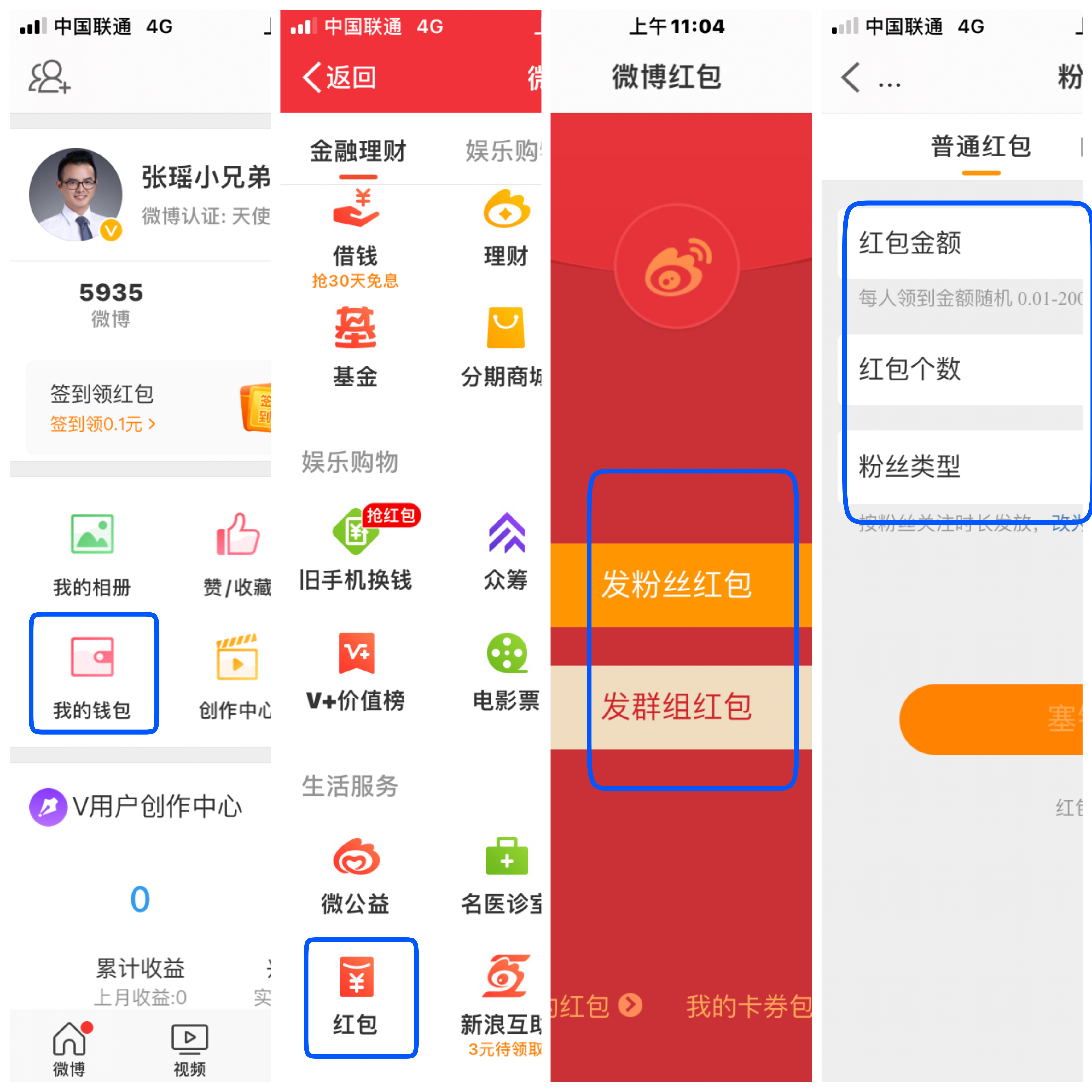 1、粉丝红包——点击微博客户-我-微博钱包,选择生活服务标签中【红包】,选择【发粉丝红包】进入发放页面