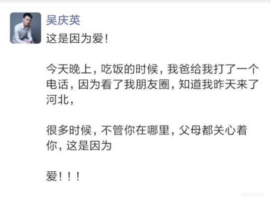 我再给你举例一个,上次,我去石家庄,李老师请我们在皇宫大酒店吃饭,在吃饭的时候,我爸给我打电话了,因为看到了我来石家庄,后面我就写了一条文案