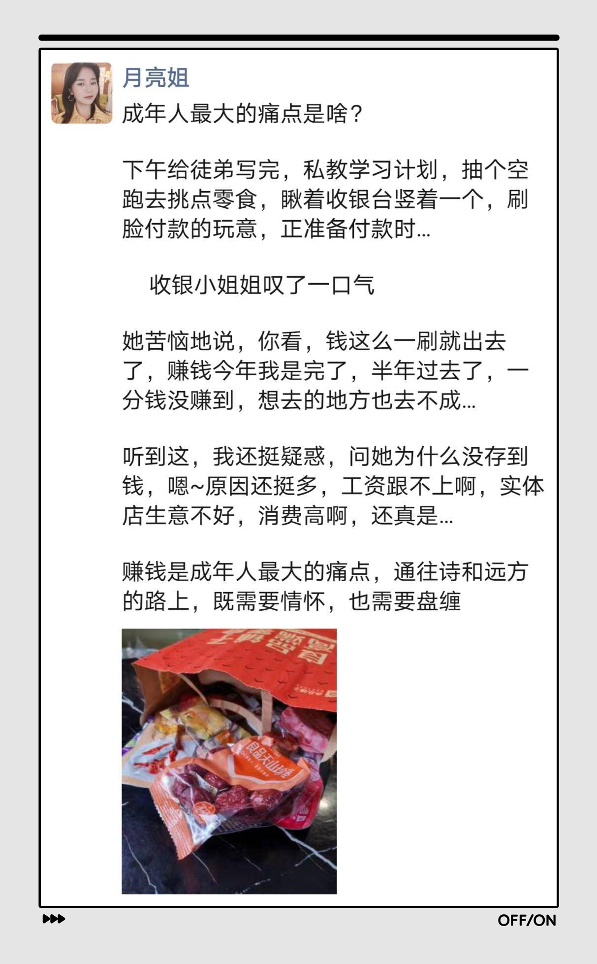 既然说了,月亮姐就多说一句哈,如果你是做线上营销的,那么,你的人设,一定是积极向上,正能量的朋友圈,为什么要这样写?