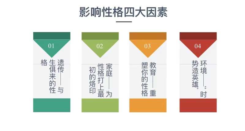 我们每个人当下呈现出来的所谓性格,都是有它内在部分和外在部分,内在部分就是遗传基因,外在部分就是我们所处的环境,那么性格心理学把影响一个人性格的因素分为四个方面:基因、童年家庭、教育、环境