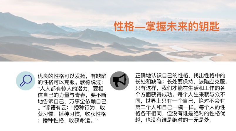 正确地认识自己的性格,找出性格中的长处和缺陷;长处要保持,缺陷应克服。只有这样,我们才能在生活和工作的各个方面获得成功。每个人生来就与众不同,世界上只有一个自己,绝对不会有第二个人和自己一模一样。每个人的性格各不相同,但没有谁是绝对的性格优越,也没有谁是绝对的一无是处。