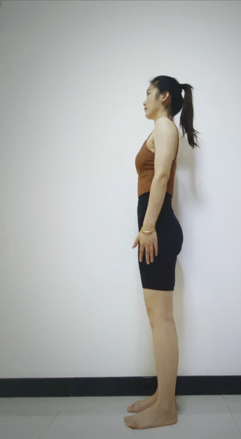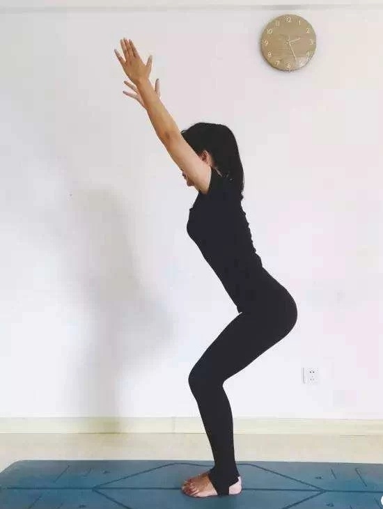 山式站立垫子上,髂前上棘、膝盖、二三跟脚趾在一条线上;双脚分开和骨盆同宽,骨盒前倾的同学可以让坐骨找脚后跟打开下背部空间;收腹、收肋骨、肩胛平贴在后背上,锁骨向两侧展开,耳垂来到肩膀正上方,头顶心向上带动整条脊柱延展,双臂经体侧上举过头顶,大臂外旋给颈椎更多空间,带着延展的感觉,以髋为折叠点,身体向前向下胸腔和头顶心同时向前延展,头顶心和胸腔不断向前带动整条脊柱延展,让脊柱保持正常的生理曲度,呼气一节节弓背起身,肩膀和头放松,一节节向上。