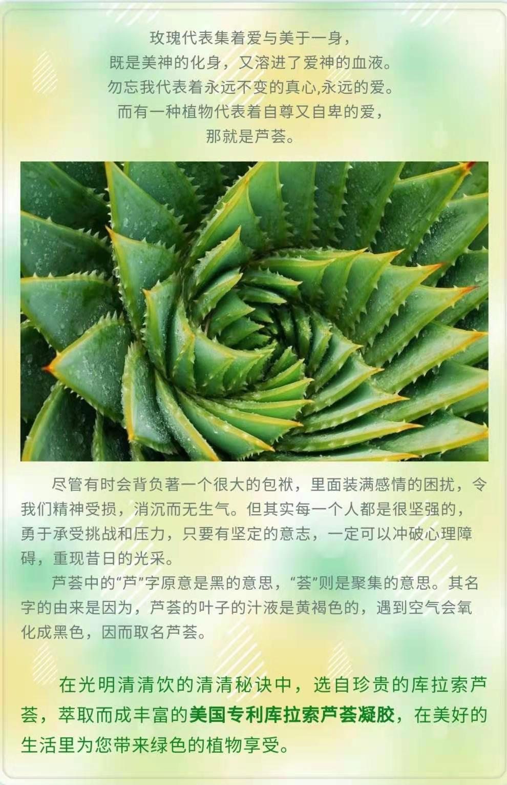 芦荟中的粘液(mucin,就是蛋白质),是以arboran A Baloe mannanaloetin等多糖类为核心成分,粘液类物质是防止细胞老化和治疗慢性过敏的重要成分。粘液素存在于人体的肌肉和胃肠粘膜等处,让组织富有弹性,如果液素不足,肌肉和粘膜就会丧失了弹性而僵硬老化。构成人体的细胞,如果粘液素不足,细胞就会逐渐衰弱,失去防御病菌、病毒的能力。