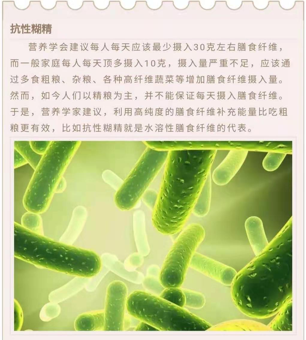 抗性糊精不被吸收,反被人体肠道中的有益微生物利用,刺激益生菌生长、繁殖,抑制肠道有害微生物,为人体提供有益的调节物质,提高免疫系统和肠道功能。抗性糊精经过肠道有益菌发酵产生短链脂肪酸,产酸量较其他膳食纤维多,这些短链脂肪酸能够阻止癌细胞生长繁殖,预防直肠癌。另外,抗性糊精遇水膨胀增加粪便体积,促进肠道蠕动,预防便秘、痔疮等疾病。