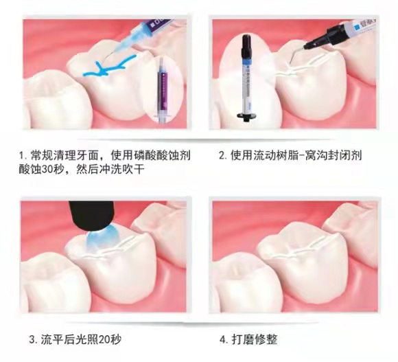 窝沟封闭术操作简单,安全,无需钻牙,无创伤,无疼痛,操作时间短,易于孩子的接受。它是指不去除牙体硬组织,也就是不用磨牙的前提下,在点隙勾裂处涂布一层粘接性树脂来保护釉质,也就是牙的最外的保护层,不受细菌及代谢产物的侵袭,达到预防龋病发生的一种有效防龋方法。那么这层粘接性的树脂就叫窝沟封闭剂,它是一种流动的树脂材料,缓缓地渗入窝洞,然后光照固化,将窝沟填平,让牙面变得光滑易清洁,相当于给牙齿罩上一层保护膜。