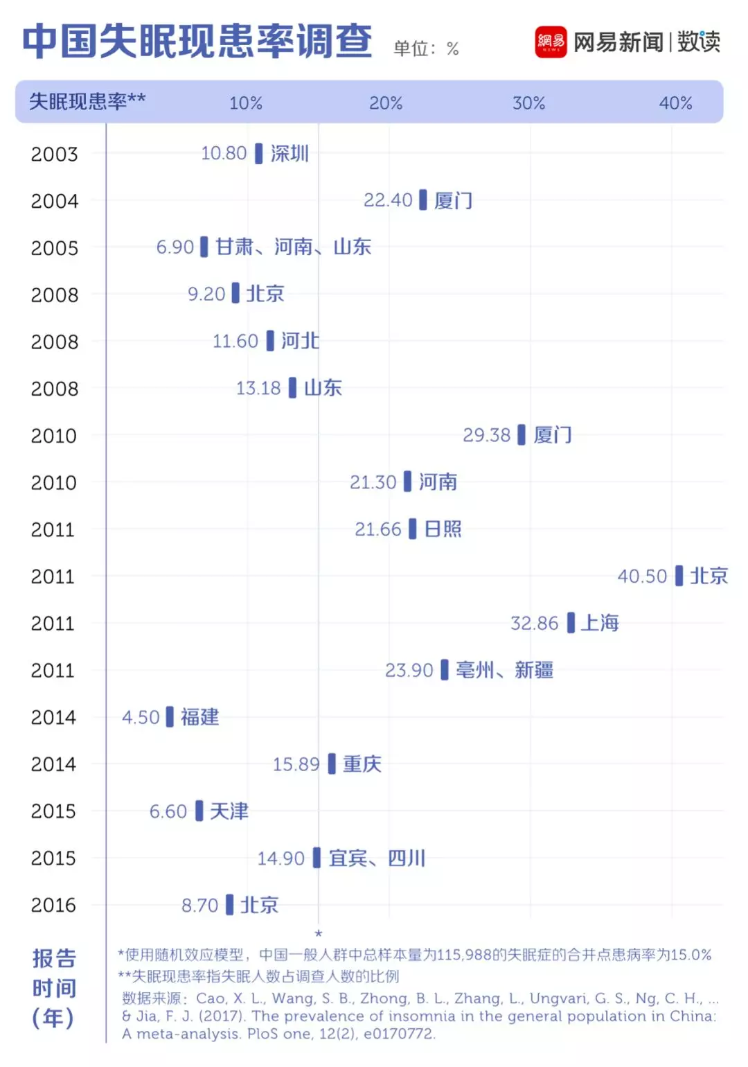 15%的数字是如何得出的,报告没有详细解答。不过,一份发表在《公共科学图书馆:综合》上的针对中国人口失眠患病率的荟萃分析,也得到了相同的数据。