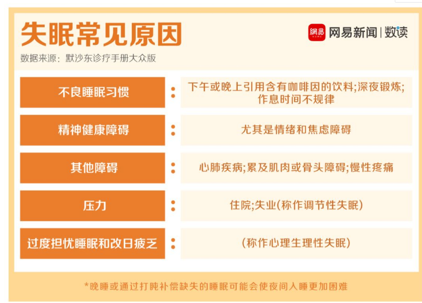 《默沙东诊疗手册》是世界上使用最广泛的医学信息资源之一,在它的大众版中,最常见的失眠原因主要有如下五种。[10]