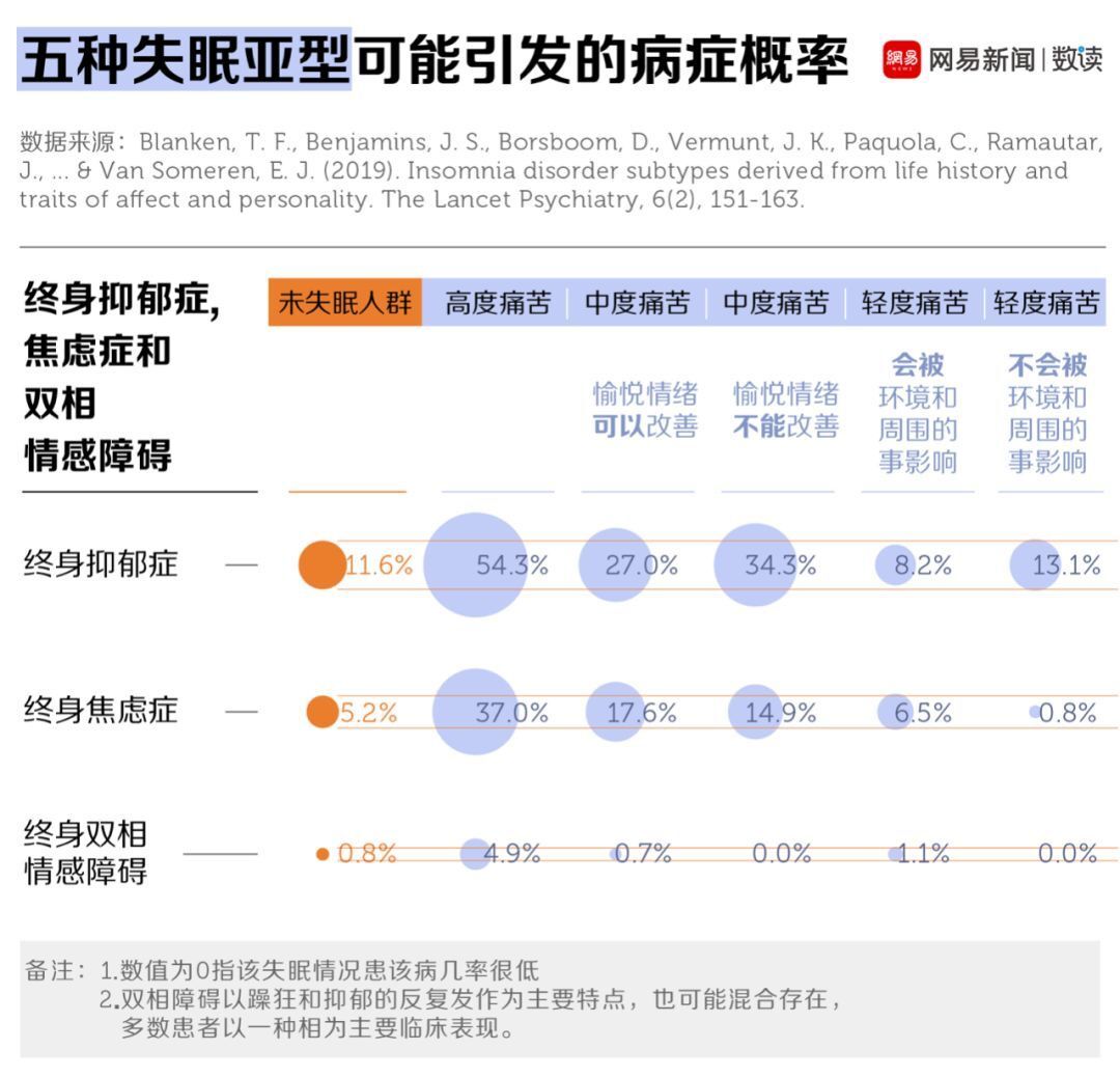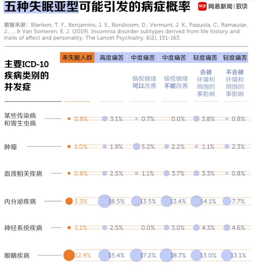 医学杂志《柳叶刀》2019年1月发表的论文《失眠症亚型来源于生活史、情感和人格特征》将“失眠”分成了五个亚型,分别是“高度痛苦的失眠”“是否能被愉悦情绪改善的中度失眠”和“是否会被外界环境刺激的轻度失眠”。[8]