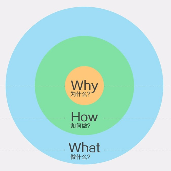 通常电脑厂家在宣传自己的产品时,一般会这么讲:我们做了一台最棒的电脑,用户体验良好,使用简单,设计精美,买一台吧!而苹果公司在推介他们的产品的时候,就巧妙的使用了黄金圈法则:Why,我们做的每一件事情,都是为了突破和创新。How,我们坚信应该以不同的方式思考。我们挑战现状的方式是通过把我们的产品设计得十分精美,使用简单和界面友好。What,我们只是在这个过程中做出了最棒的电脑。想买一台吗?没有比较就没有伤害,买吗?买啊。