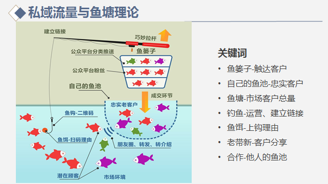 简单讲,就是我最好自己的私域,把我的客户养起来,同时通过一些鼓励措施,让我的客户自然传播,为我带来新客户。这个逻辑是不是看起来比较可行,性价比高,投入少,是一个可以持续运营的方式呢?的确是这样,提到私域流量运营,我们就一定要聊聊鱼塘理论,理解其背后的运营逻辑。